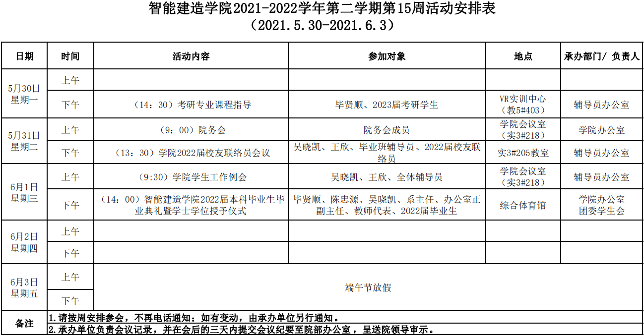 智能建造学院2021-2022学年第二学期第15周活动安排表