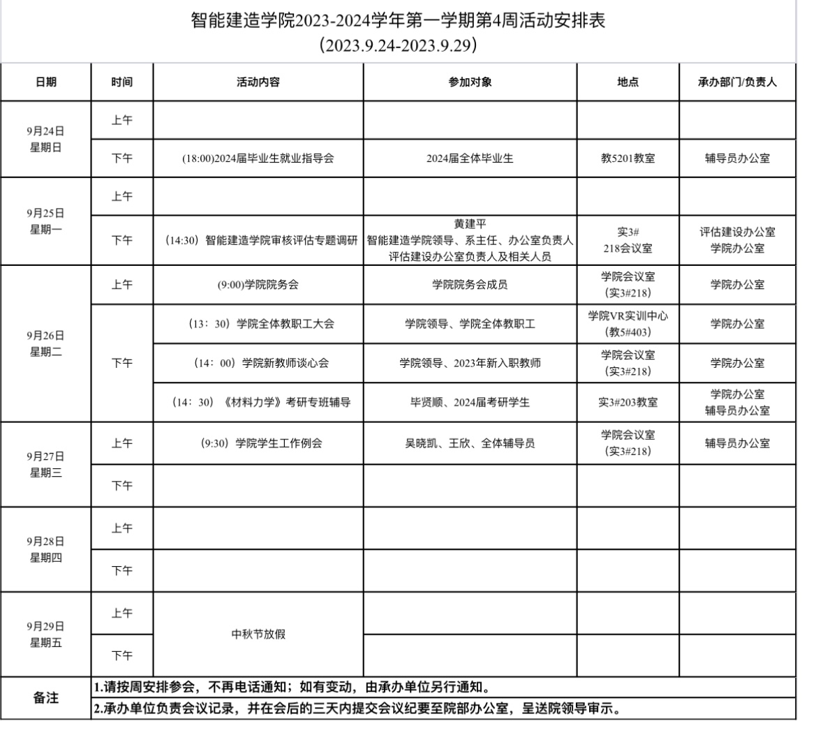 智能建造学院2023-2024学年第一学期第4周活动安排表