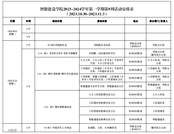 智能建造学院2023-2024学年第一学期第9周活动安排表