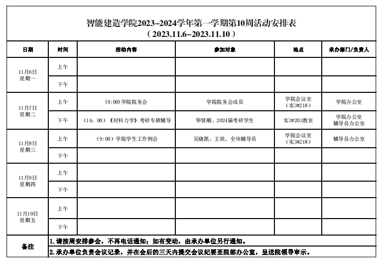 智能建造学院2023-2024学年第一学期第10周活动安排表