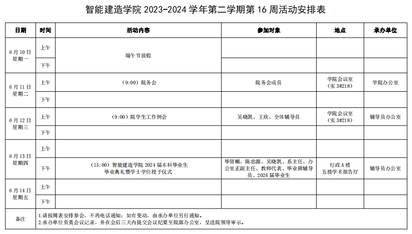 智能建造学院2023-2024学年第二学期第16周活动安排表