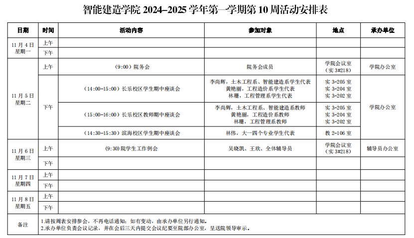 智能建造学院2024-2025学院第一学期第10周活动安排表
