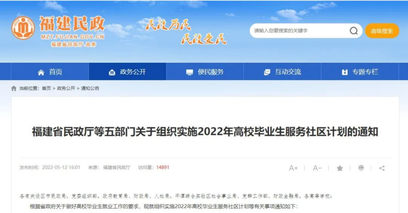 福建省民政厅等五部门发布《开元网页版组织实施2022年高校毕业生服务社区计划的通知》